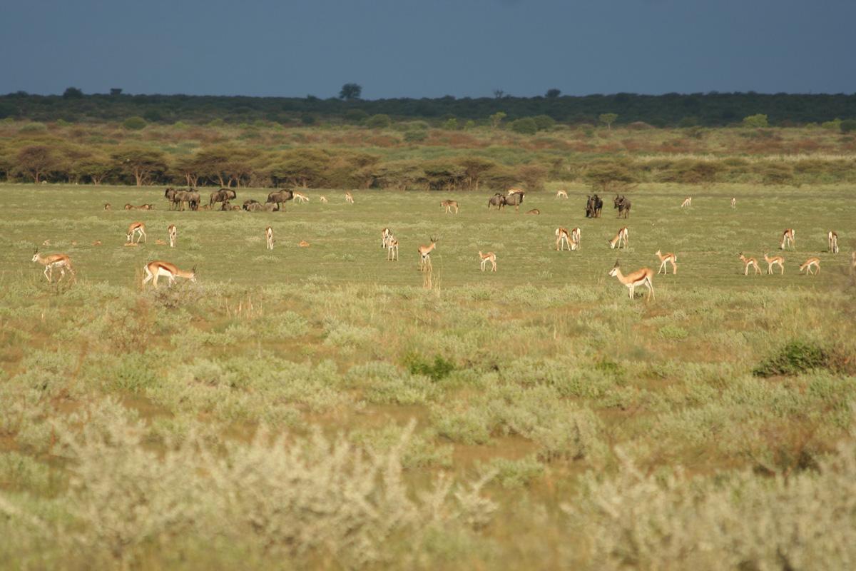 Beste Tiersichtungen gibt es von Februar bis April an den Pfannen des Deception Valleys. Riesige Herden von Springböcken, Oryx-Antilopen und Gnus treffen sich dann an den Wasserstellen und fressen sich einen Speckmantel an. Das wiederum reizt die berühmten Kalahari-Schwarzmähnenlöwen, Geparde und Schakale, die mit den großen Herden ziehen und im Grunde einfach nur das Maul aufsperren müssen, um am Ende der Nahrungskette zu bleiben. Das Gras ist ca. 30 cm hoch, so dass Geparde und Kleintiere kaum zu entdecken sind. Die Giraffen wechseln oft von den Akazien ins offene Gelände um Staudenpflanzen zu fressen. Weltweit einmalig. Wasser in den Pfannen lockt auch eine artenreichere Vogelwelt an. Schlechte Nachricht für die Frösche.