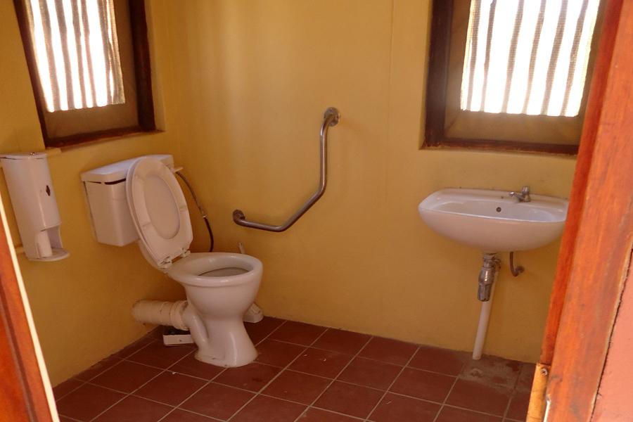 Wasserloch: Nossob verfügt über einen Hide ( Versteckbunker ). Man kann sich dem Wasserloch gedeckt annähern und er schirmt auch Geräusche aus dem Rastlager ein wenig ab. Im Unterstand sind Holzbänke mit Sicht in drei Richtungen und Ablage für Fernglas, Bestimmungsbücher und Kameras.