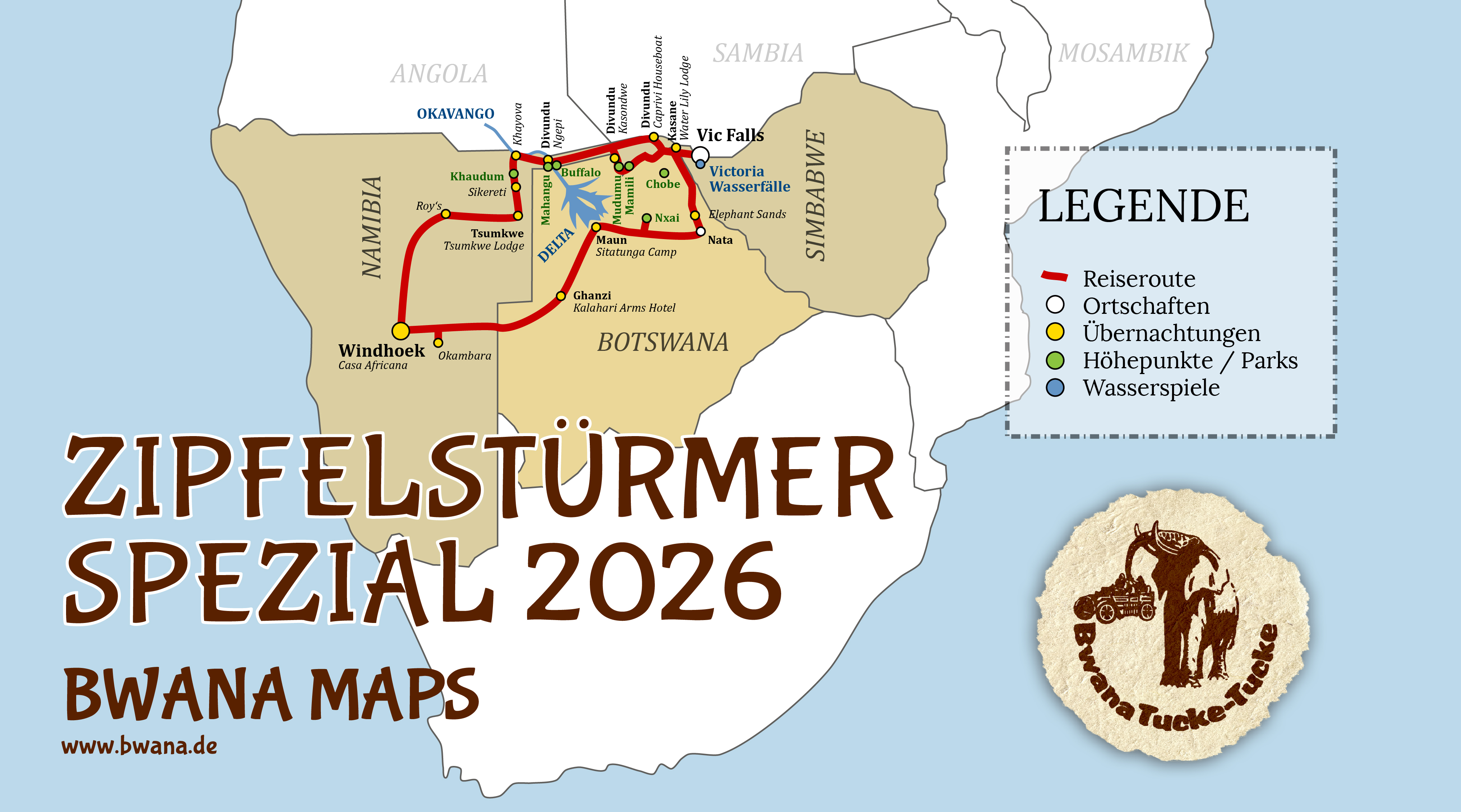 Deutschsprachig geführte Erlebnis-Safari mit Carsten Möhle. Erleben sie eine abwechslungsreiche Spezial-Reise von Windhoek über das Buschmannland, durch den Khaudum und Caprivi-Zipfel bis hoch nach Vic Falls. Zurück gehts durch Botswana mit Bains Baobabs und Okavango Delta.
